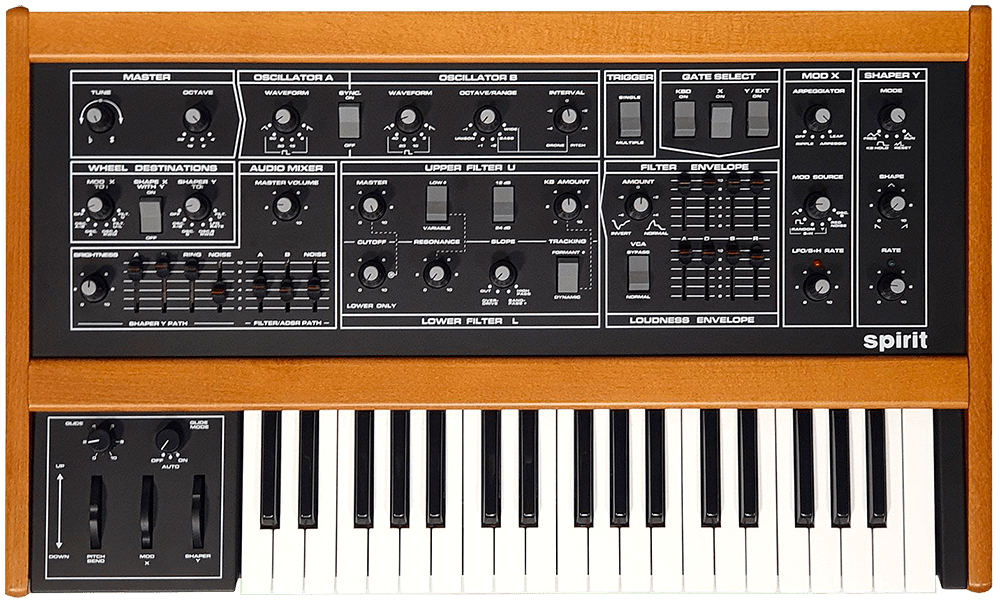 The Spirit routed the oscillators through two distinct signal paths, one with the VCFs and VCA (referred to as the upper Filter/ADSR path) and another with a mixer that includes the ring modulator and noise generator controlled by the "Shaper-Y" LFO/EG. The Spirit's filter section featured both an upper low-pass filter and a lower filter with high-pass, band-pass, and a distinct "Overdrive" mode for adding a distinct saturated quality to the sound. It provided switchable filter slopes of either 12dB or 24dB, and an independent filter envelope enabled precise control of the filter's dynamics, separate from the ADSR envelope. Dynamic keyboard tracking is available for both filters, with a switch for a fixed formant option for the lower filter.